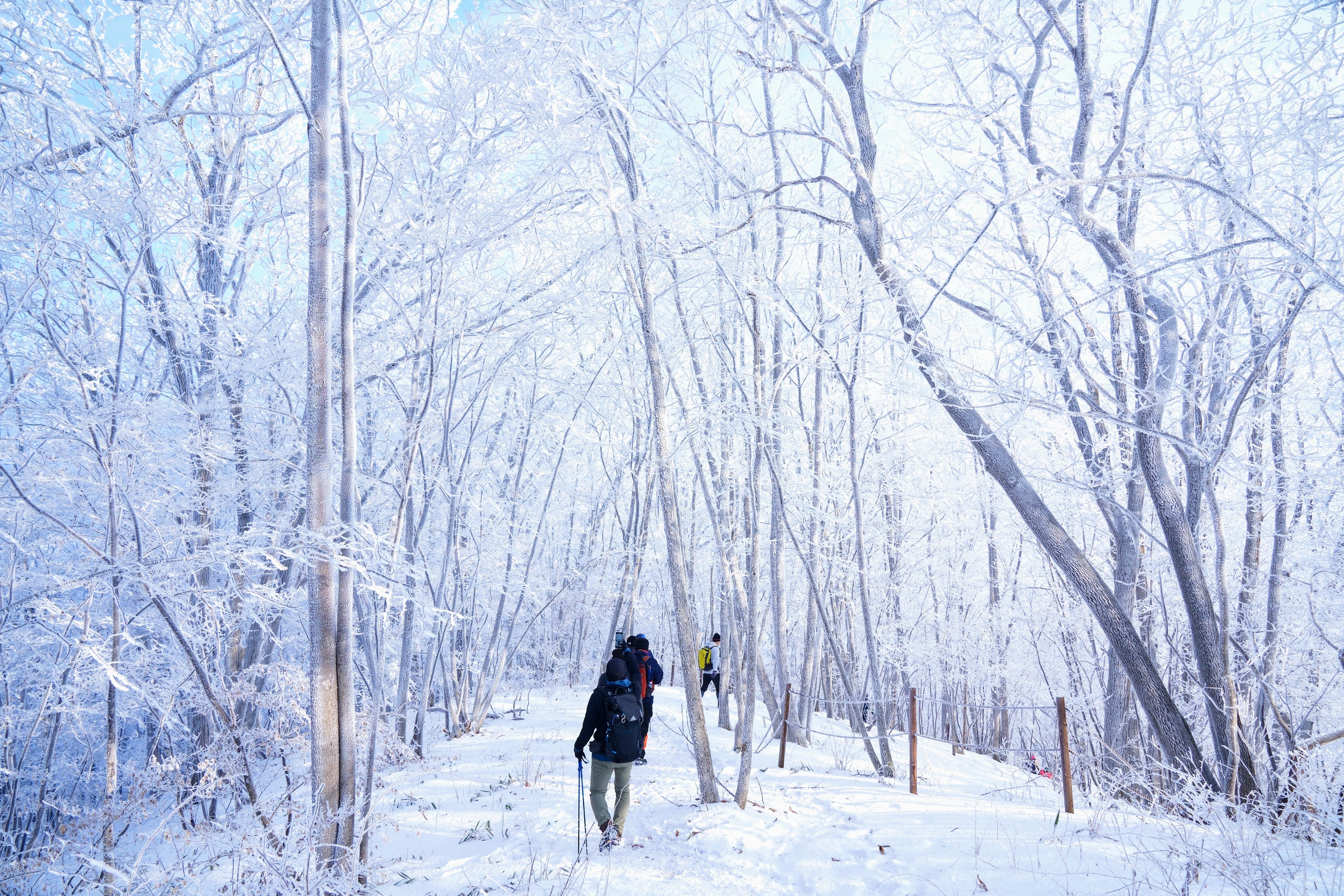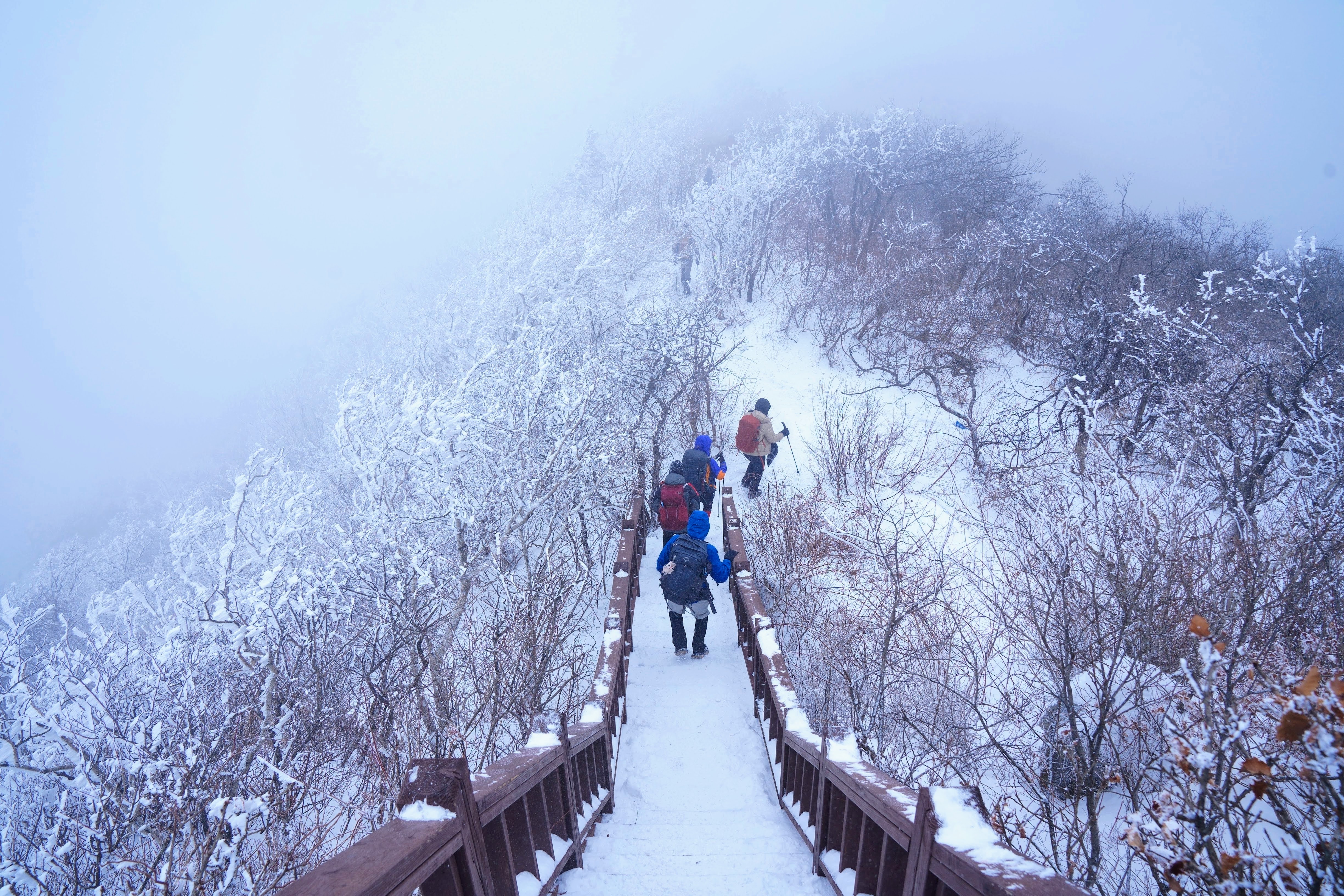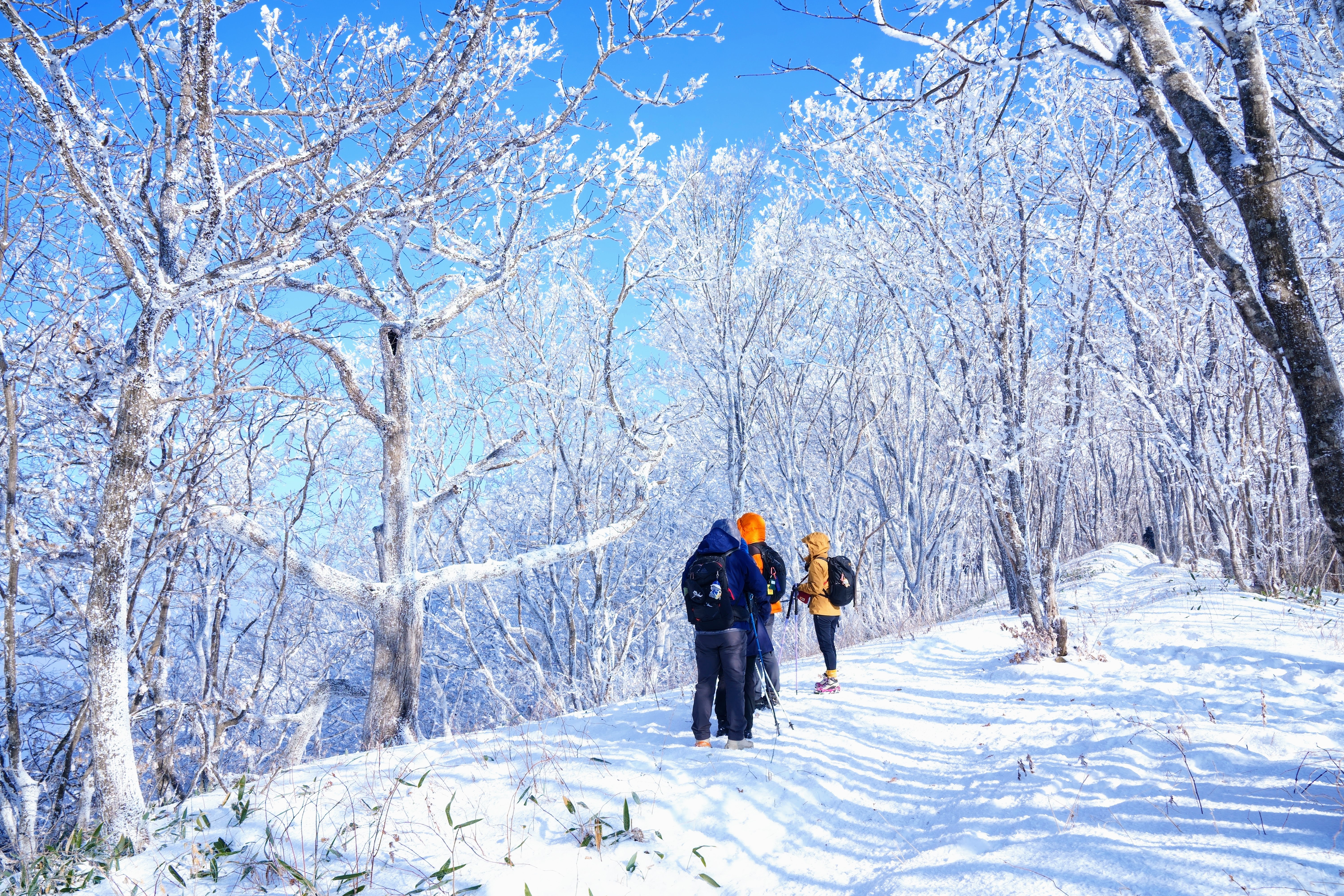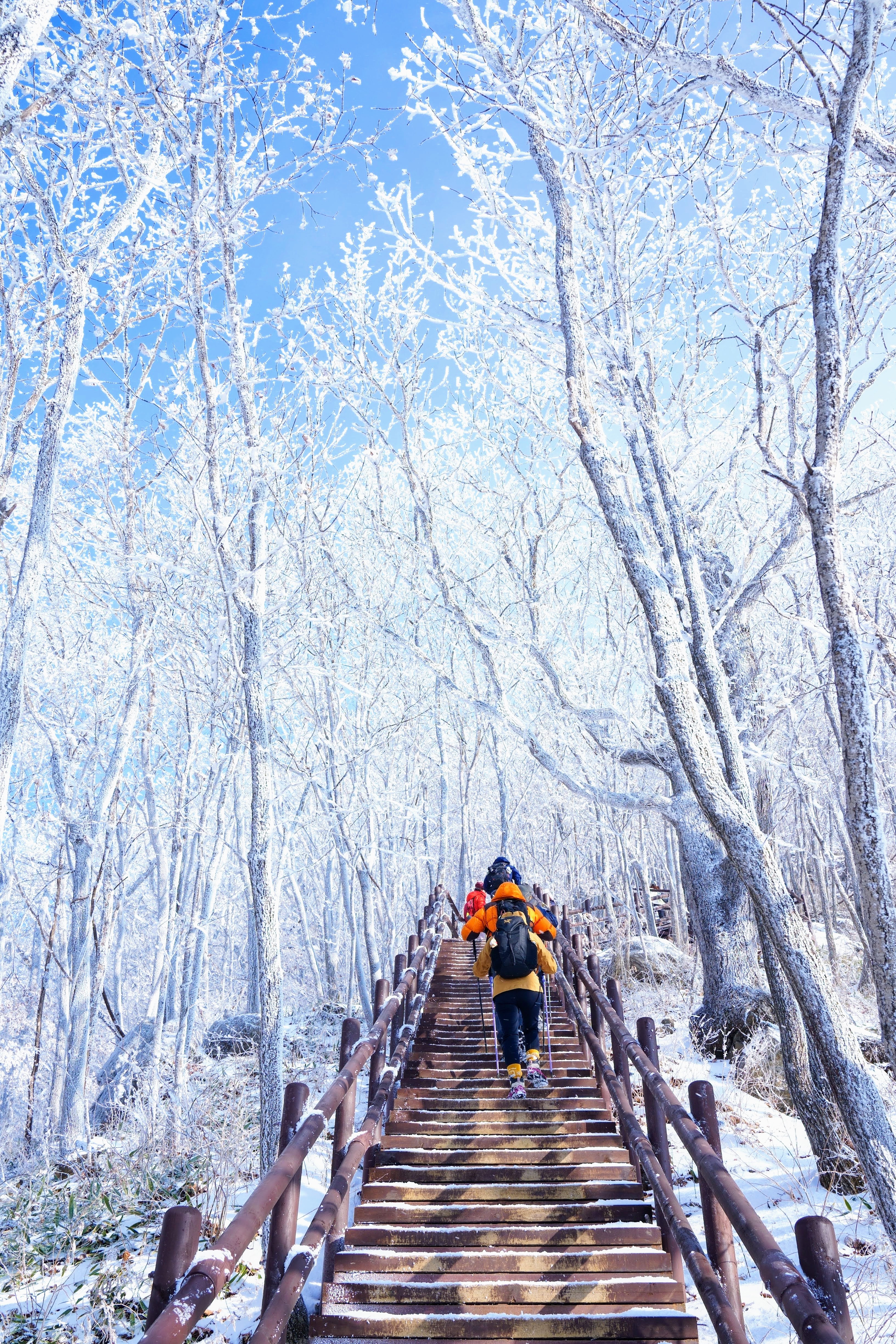 운두령에서 버스는 정차하고 버스에서 내리니, 운두령 휴게소 주변에도 상고대가 하얗게 피었습니다. 휴게소 데트에서 산행 준비를 하는데, 고지대인데다가 바람이 불어오니 추위가 파고 듭니다. 아이젠까지 착용하고 계단을 따라서 능선길에 올라서 가늘지만 하얗게 상고대가 붙은 나무숲길을 따라서 걸어갑니다. 파란 하늘 배경에 하얀 산호초같은 나뭇가지의 앙상블.. 겨울 산행의 최고의 행복이 아닐까요.