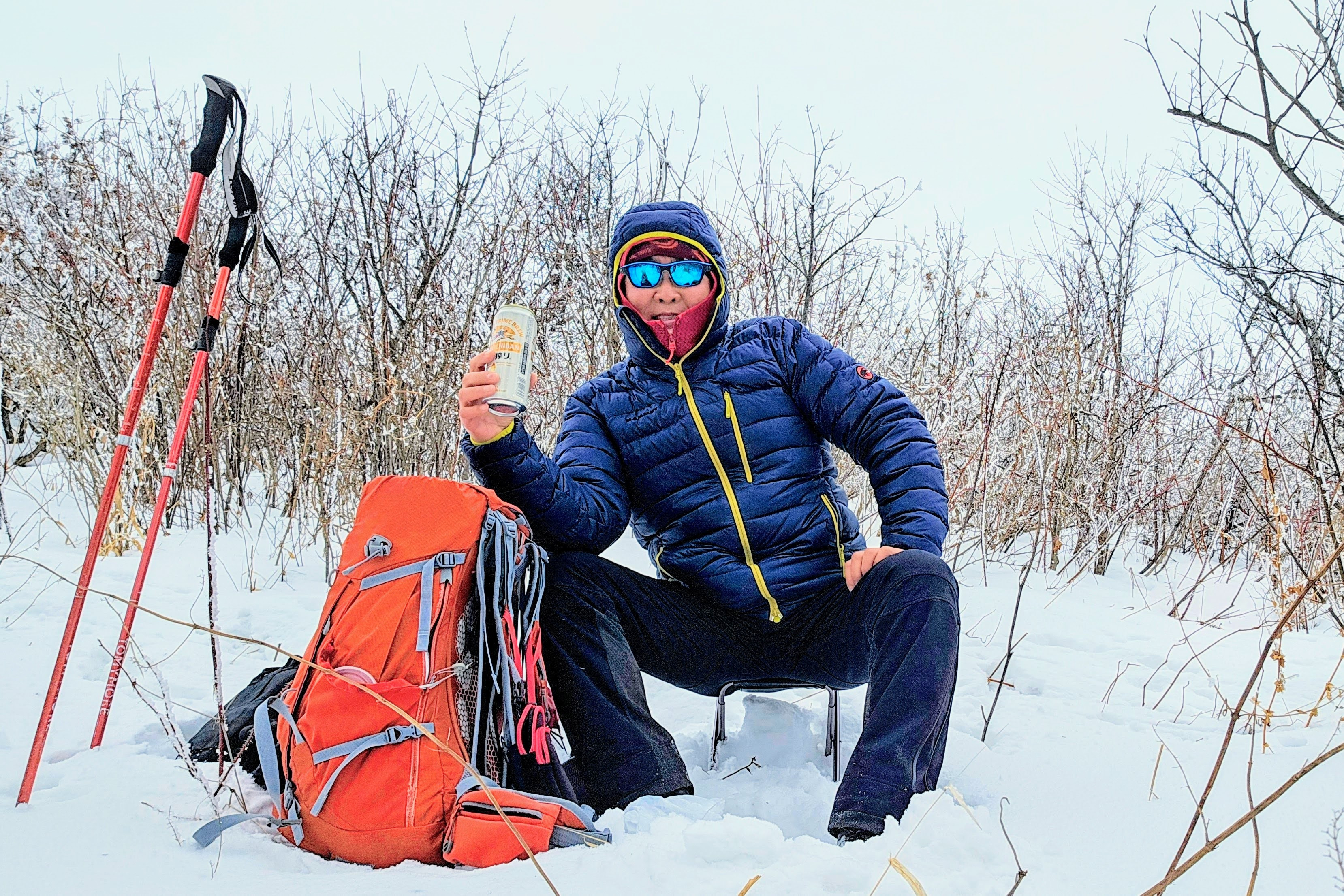 어느덧 정상에 이르게 되고 정상에는 비교적 적은 산객들이 인증샷을 담으려고 대기하고 있습니다. 그냥 지나치기 아쉬워서 정상석에서 멀리서 인증 사진을 담고는 서풍을 피해서 정상 뒷편길로 들어가니 바람이 막혀서 큰 추위는 피할 수 있겠네요. 숲속 눈밭에 자리를 잡고는 앉아서 간단한 먹을거리와 맥주 한 캔을 꺼내서 눈밭에서의 휴식 시간을 갖습니다.
