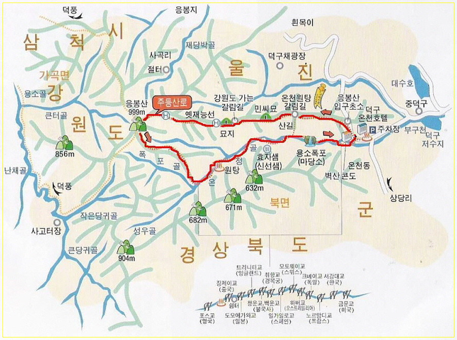 | 5.산행코스 | 덕구온천~옛재능선~제1, 2헬기장~응봉산정상~원탕~효자샘~용소폭포~덕구온천( 약 11.5km) |