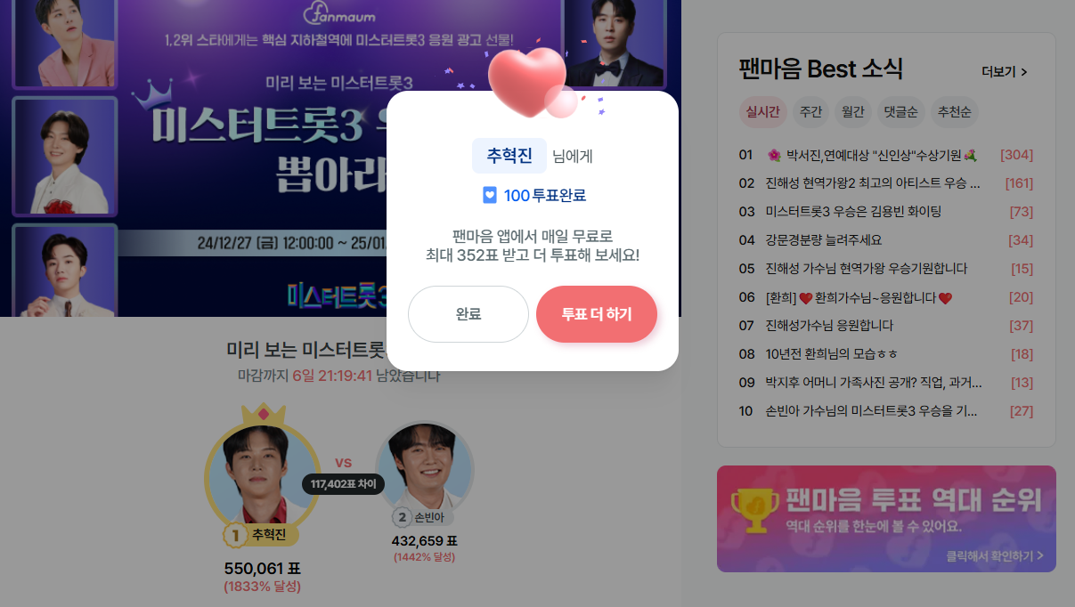 찾아보니 웹 투표로 하루 최대 100표 가능하고 앱 투표로 무한 가능!