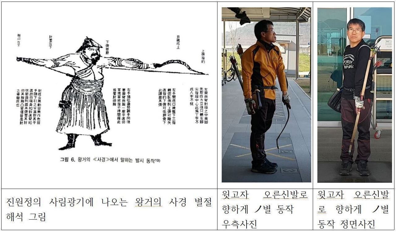 좌측은 진원정의 사림광기에 나오는 왕거의 사경 별절궁체를 설명한 그림이고, 우측은 풍석 서유구선생의 사결, 웅천 이춘기공의 사예결해, 청교 장언식공의 정사론과 책 조선의 궁술이 설명한 별절동작을 필자가 재연한 동영상에서 캡쳐한 사진이다.