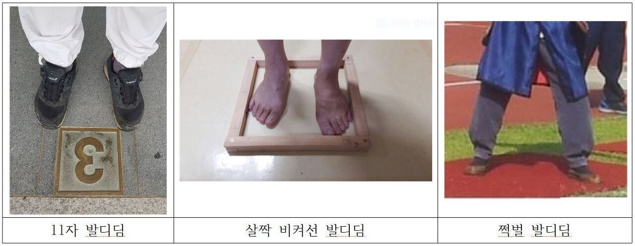 세 발디딤을 비교했을때 쩍벌 발디딤은 발시후 줌손과 활장이 불거름으로 떨어지기 어려운 발디딤이다.
