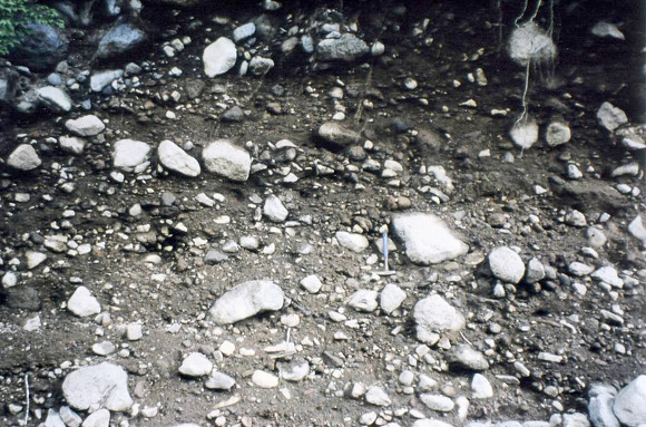 사진 2. 대력 역암, 한발교 상류, 해발고도 960m. (윤선, 1993. 8. 1. 촬영.)