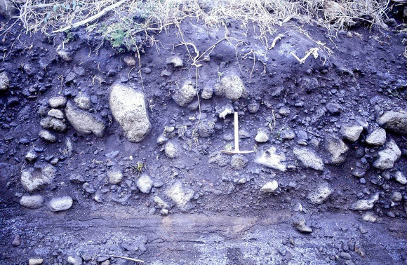 답댓글 작성자장두곤 작성시간 12.02.14 2)그림 5의 사진에서 붉은색 matrix는 volcanic ash 로 하부에 협재된 자갈층은 volcano breccia로 해석될수 잇는 가능성은 없는지요?
