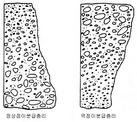 한 층리를 볼 수 있을 뿐입니다. 역점이분급층리를 이루기도 합니다.