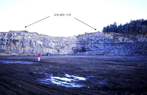 사진 3. 표선리현무암군 지대의 파형 지형, 부일산업 채석장. (윤선, 2001. 11. 22. 촬영.)