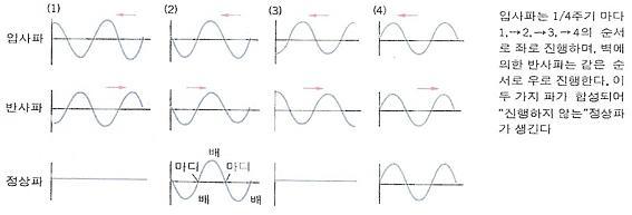 진동의 마디점이나 배 등의 위치가 공간적으로 이동하지 않는 파동을 정상파라고 합니다. 정재파(定在波)라고도 하며 진행파(進行波 progressive wave)와 대비됩니다. 진행방향만이 서로 다른 2개의 진행파가 간섭하면 정상파가 합성됩니다.