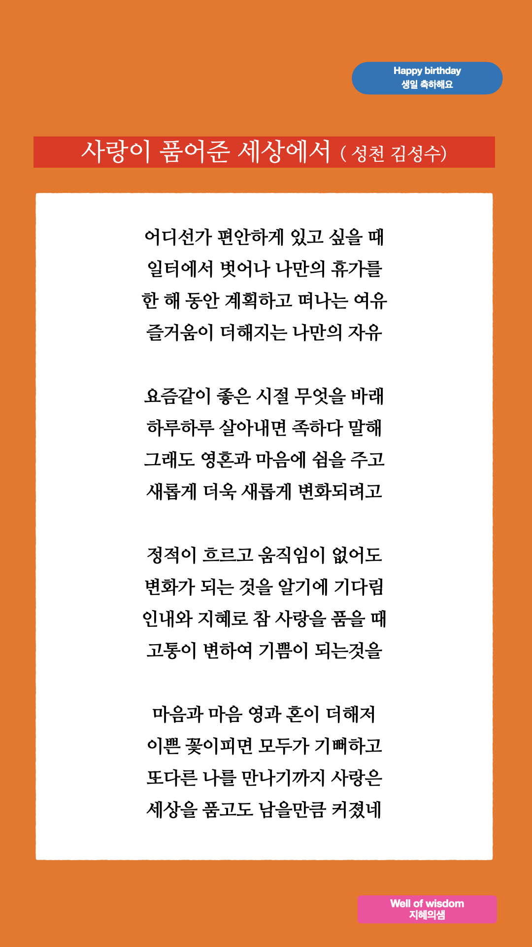 #시와별과사랑 #사랑이품어준세상에서 #생일축하시 #생일선물 #생일축하글 #HBD #love #사랑 #Happy #birthday #생일축하드립니다 #성천 #김성수시인 #성천김성수 #Happy_birthday Enjoy happiness in a world embraced by love. When I want to be somewhere comfortable, I get away from work and go on my own vacation. We go on vacation to rest our souls and minds and become new and more transformed. Until I met another me, my love had grown so much that it could embrace the world. #휴가 #나만의자유 #나만의휴가 #영혼과마음 #쉼 #세상을품고도남을만큼 #사랑이커졌네