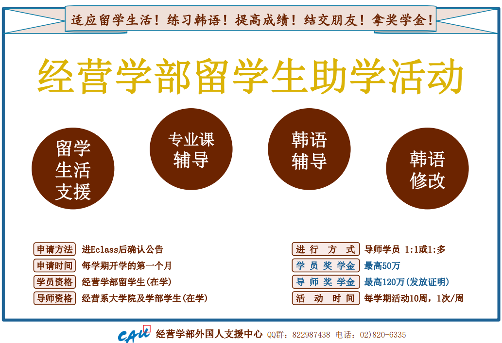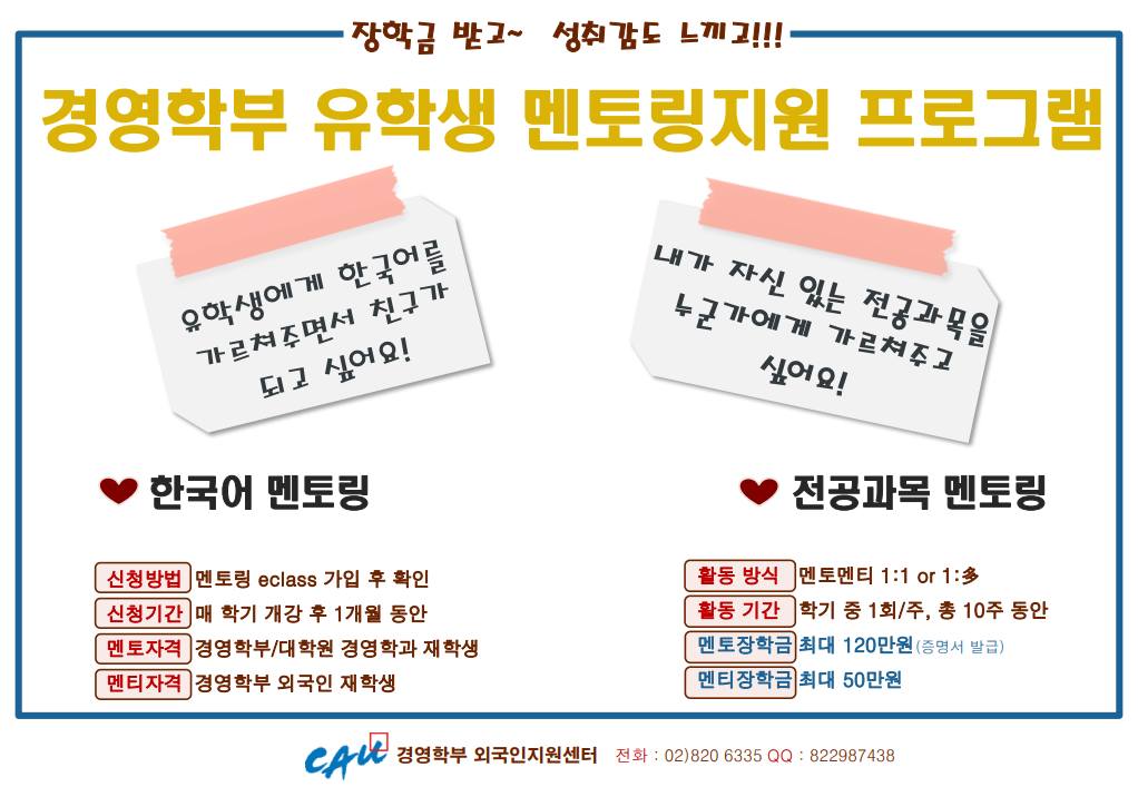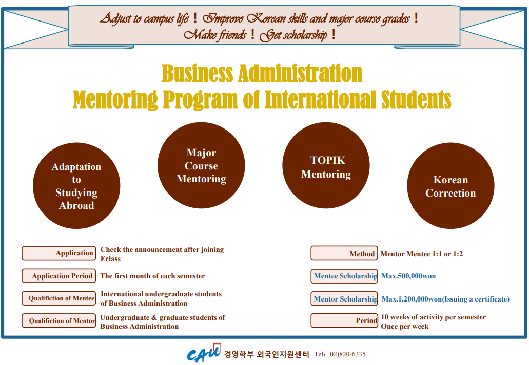 경영학부외국인지원센터는 향후 여러분께서 더욱 편리하게 멘토링 프로그램을 진행하실 수 있도록 멘토링 프로그램 관리업무를 본 카페에서 E-class로 이전하였습니다.