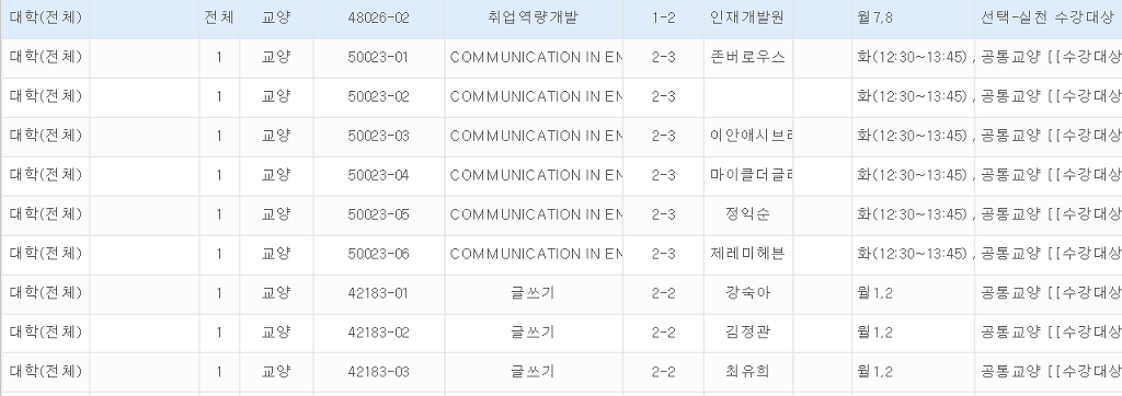 1. 예를 들어 과목번호 42183-03 글쓰기 최유희교수님에서 월 1,2는