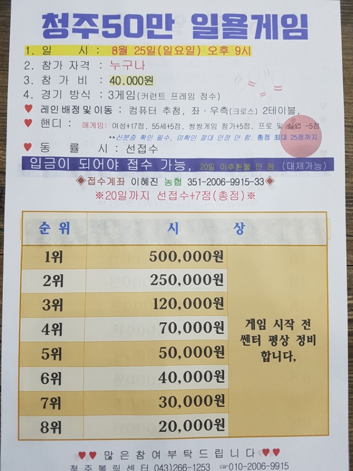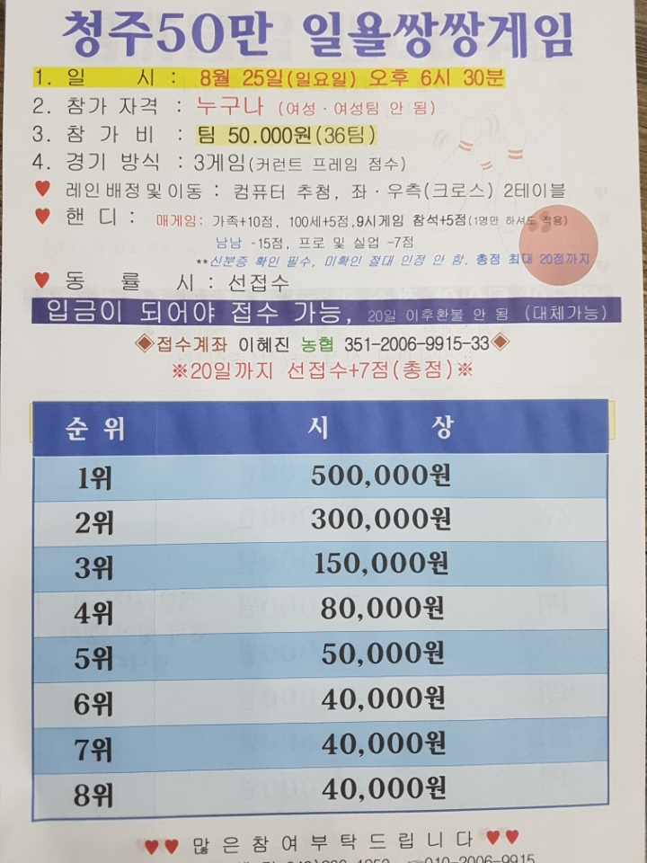 [스크랩] 8월 25일 일욜쌍쌍(6시30분) 및 개인전(9시) 게임 작성자청주뽈장행복한계연이|작성시간19.08.22|조회수152 목록 댓글 0 글자크기 작게가 글자크기 크게가 많은 관심 부탁드립니다. 다음검색 스크랩 원문 : 청주볼링센터 현재 게시글 추가 기능 열기 북마크 공유하기 신고 센터로 신고 댓글 댓글 0 댓글쓰기 답글쓰기 댓글 리스트