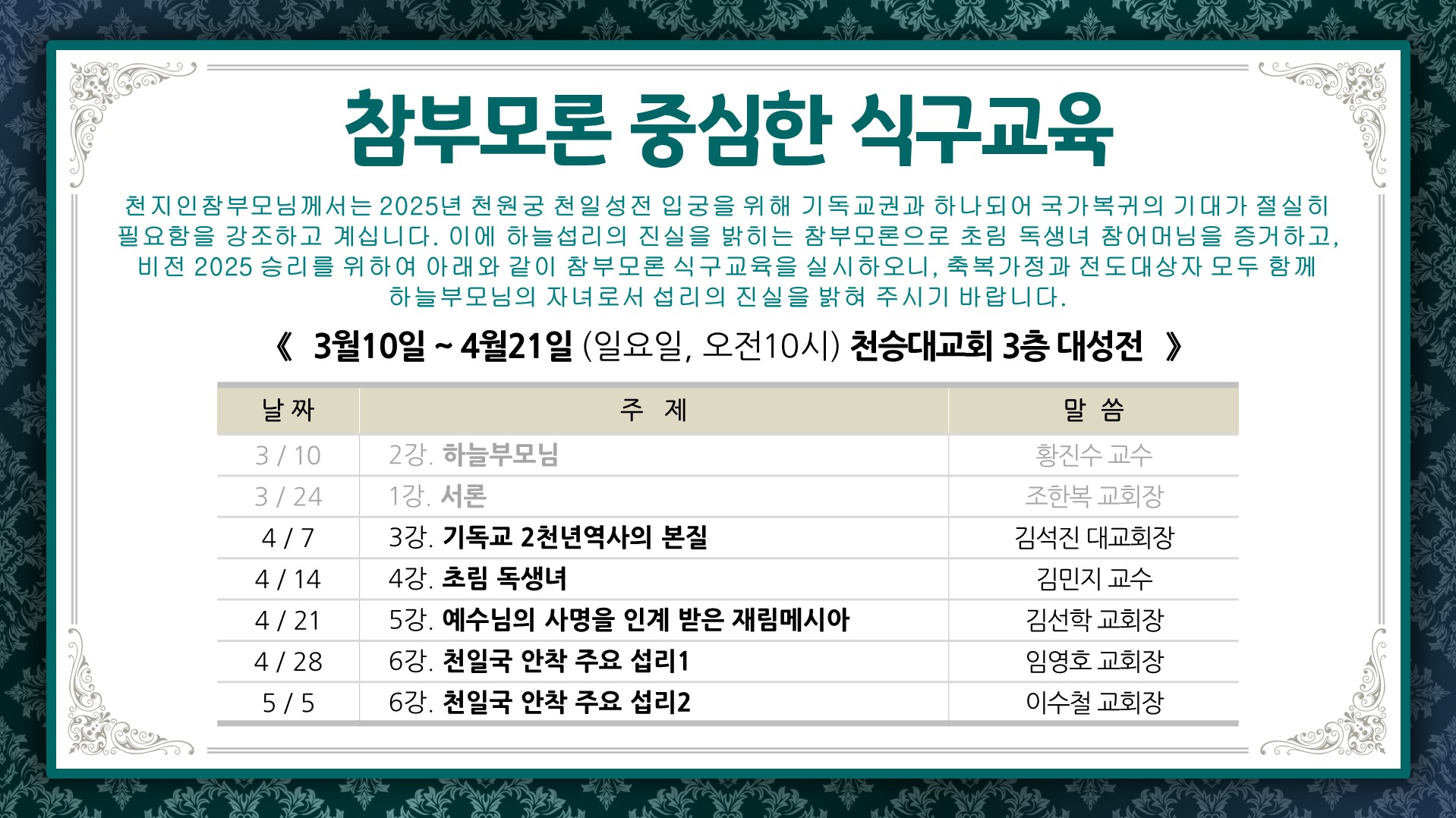 참부모론 중심한 식구교육 일정--(변경) 작성자천원궁 천승대교회 카페지기|작성시간24.03.23|조회수96 목록 댓글 1 글자크기 작게가 글자크기 크게가 다음검색 현재 게시글 추가 기능 열기 북마크 공유하기 신고 센터로 신고 댓글 댓글 1 댓글쓰기 답글쓰기 댓글 리스트 작성자mujigae | 작성시간 24.03.24 안내 감사합니다 댓글 전체보기