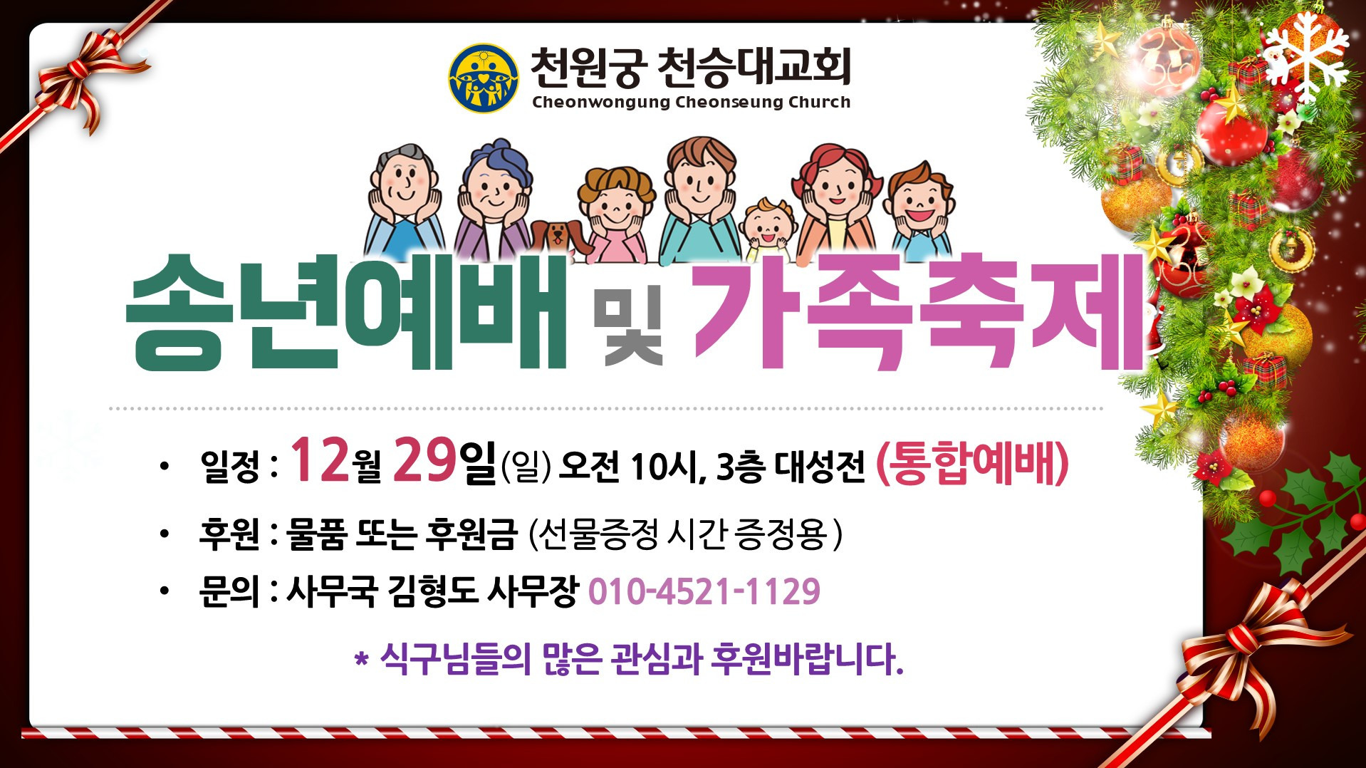 송년예배 및 가족축제 [2024.12.29.(일) 오전10시] 작성자천원궁 천승대교회 카페지기|작성시간24.12.04|조회수47 목록 댓글 1 글자크기 작게가 글자크기 크게가 다음검색 현재 게시글 추가 기능 열기 북마크 공유하기 신고 센터로 신고 댓글 댓글 1 댓글쓰기 답글쓰기 댓글 리스트 작성자mujigae | 작성시간 24.12.05 안내 감사합니다 댓글 전체보기