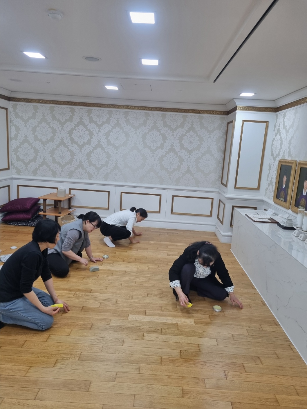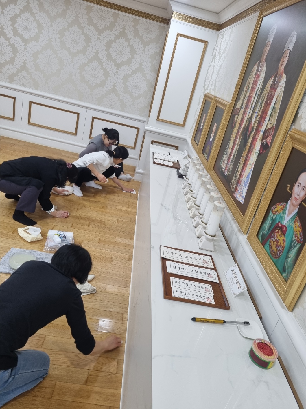 2층 공관 특별기도실에서 경배, "천일성화 1" 훈독, 기도정성을 드리고 공관 특별기도실 바닥 닦고 비왁스 바르기를 했습니다.