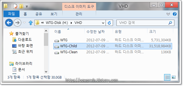 VHD 파일은 USB 외장 하드 루트에 위치해도 되고 영문으로만 구성된 폴더를 만들어 그 아래에 위치시켜도 됩니다. 관리나 구성의 깔끔함은 후자가 낫겠죠? 그래서 저는 루트에 VHD 라는 폴더를 만들고 그 안에 VHD 파일을 넣는 것으로 하겠습니다. 이 때 VHD 파일의 이름은 WTG.VHD 로 하고 (안의 파티션은) V: 드라이브로 연결하죠.