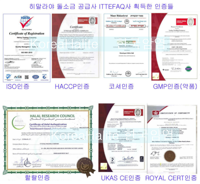 히말라야 돌소금 공급사 ITTEFAQ사가 획득한인증들.