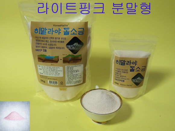 ●히말라야 돌소금 화이트는 식용소금으로는 세계가 인정하는 최고의 식용소금입니다. 초미립분자 히말라야 돌소금 화이트는 식용시 체내 세포에 신속히 흡수되어 중금속, 독성물질을 잡아 배출시켜주며 인체 세포를 생기있게 만들어 줍니다. 순수하고 달콤한 짠맛 히말라야 돌소금화이트.. ●히말라야 돌소금 핑크는 피부미용 마사지용으로 사용해도 좋고 식용으로도 좋습니다. 히말라야 돌소금 핑크는 탈모방지, 비듬제거, 노폐물제거 세안, 온천욕효과, 치약대용 어린이 피부질환 입욕제, 습진, 무좀, 건선 치료마사지 등으로 사용하시면 좋습니다. (사진기의 색감표현 불량으로 화이트로 표현되었으나 실물은 옅은 분홍빛입니다.) ● 히말라야 돌소금 라이트핑크는 화이트의 장점과 핑크의 장점을 두루 갖춘 소금입니다. 화이트와 핑크의 효과를 한번에 느낄수있는 히말라야 돌소금 라이트핑크! ◆ 소비자가격 : 히말라야 돌소금 라이트핑크 2Kg 25,000원, 500g 10,000원. ● 히말라야 돌소금의 장점 1. 약 1억년 전 원시자연의 바닷물로 만들어진 깨끗한 천연소금입니다. 어떠한 첨가제도 넣지 않았습니다. 어떠한 정제과정도 거치지 않았습니다. 천연바위소금을 사용하기 편리하게 분쇄만 한 소금입니다. HACCP, ISO9001, KOSHER, HALLA, GMP인증