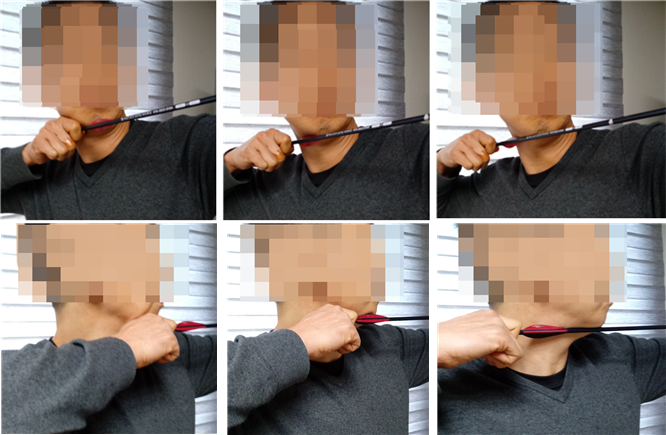제일 좌측은 양궁처럼 깍지손을 턱 아래 붙였을 때이고 이후 자세의 변화없이 직 후방으로 그대로 뺀 모습을 순차적으로 나타내었다. 사진의 위와 아래는 카메라 각도의 차이일 뿐 자세나 위치의 차이는 없다. 그림의 가운데와 제일 오른쪽 모습, 어디서 많이 본 모습 아닌가? 맞다. 바로 그 모습이다. 소위 시수 좀 낸다는 사람들의 일명 턱밑사법! 많은 사람들이 자랑삼아 유투브에 올린 바로 그 턱밑사법. 양궁과 동일한 모습에 발시까지 똑같으면서 양궁이 아니고 국궁이라 말하는 바로 그 턱밑사법이다. 그런데 필자의 눈에는 아무리봐도 양궁자세일 뿐이다.
