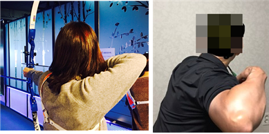 왼쪽 그림은 실내양궁장에서 양궁을 즐기는 청소년의 뒷 모습이다. 선수도 아닌 일반 청소년도 저렇게 바른자세로 양궁을 즐김에 기품이 있어보이지만 턱 밑으로 화살대를 집어넣는 턱밑사법을 뒤에서 보면 참 우스꽝스럽기 그지 없다. 뭐하자는 자세인지..