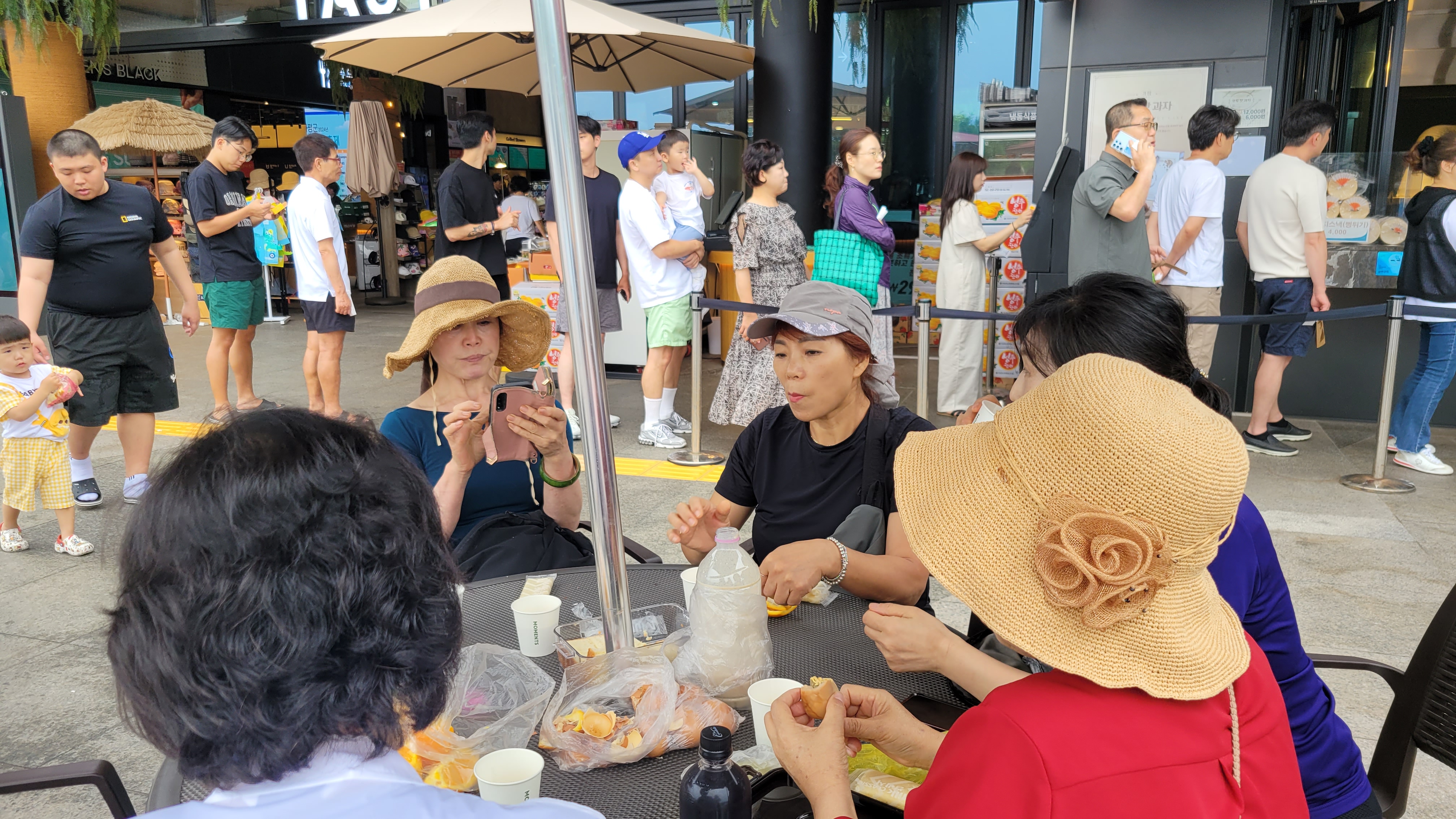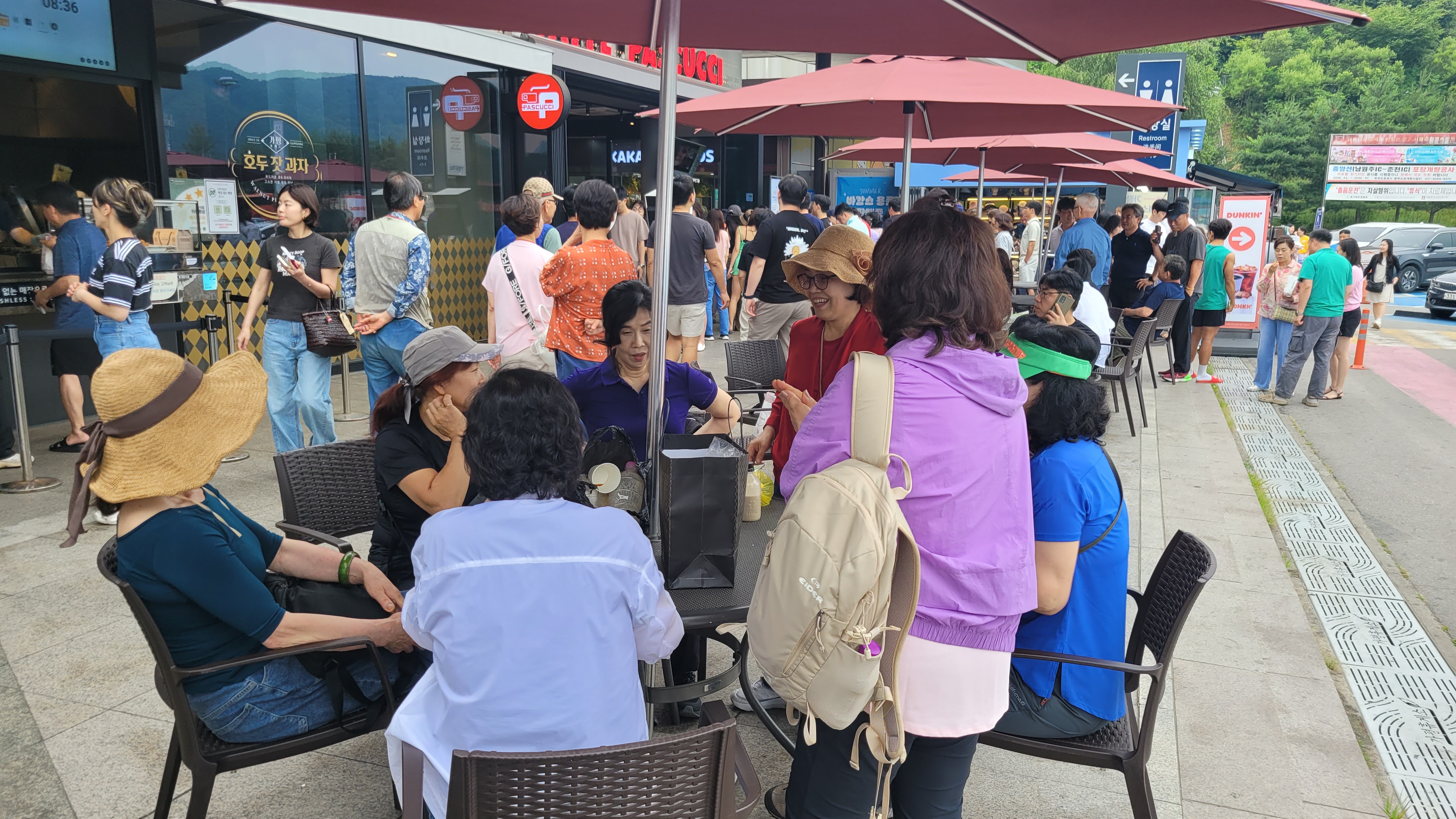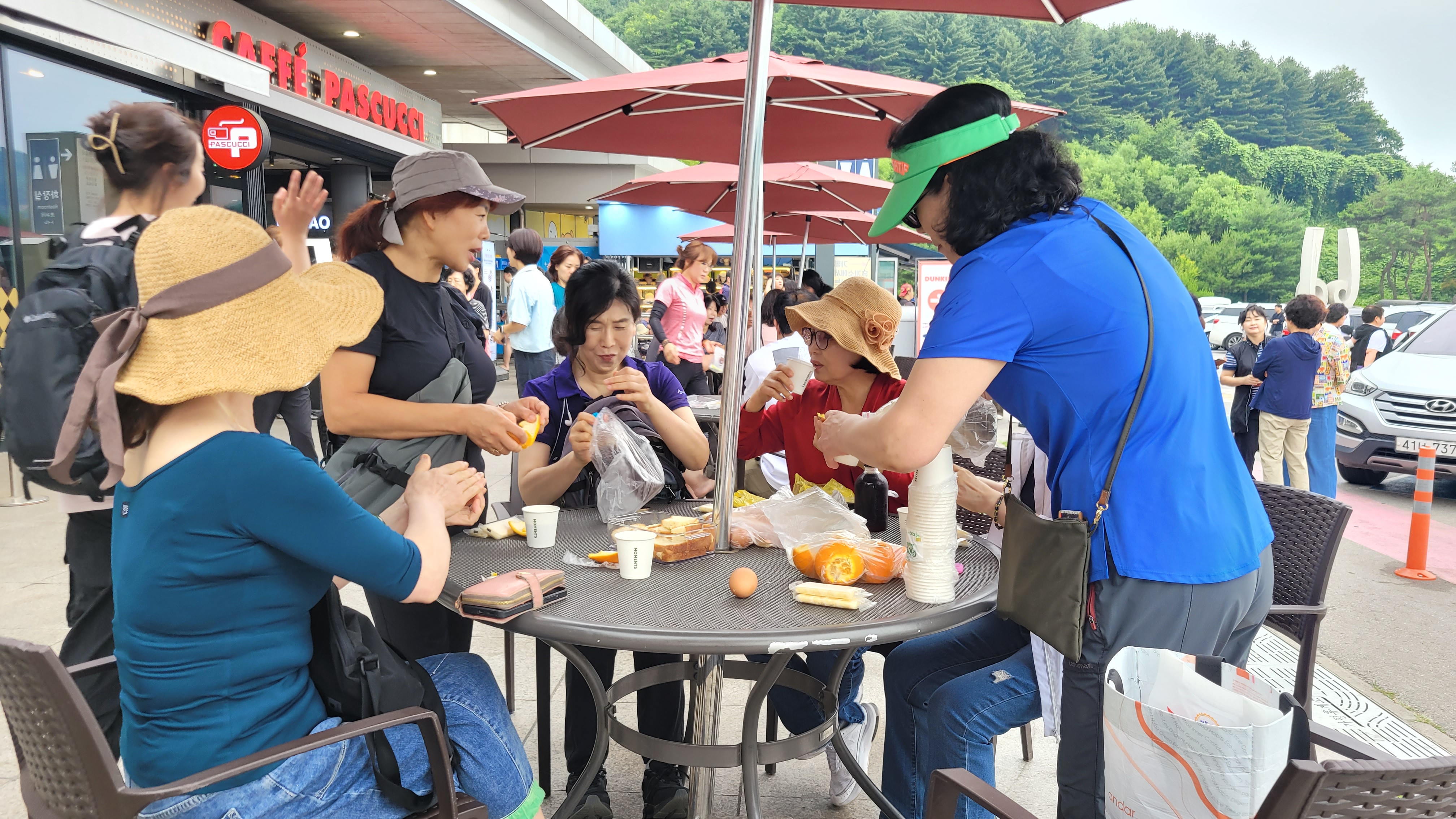 일부는 휴게소 테이블을 전세 내어 개인적으로 챙겨온 간식으로 대충 먹고