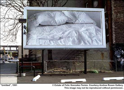 1992년 5월 16일, 뉴욕시내 곳곳의 빌보드 24곳에는 누군가 막 자고 나간듯한 새하얀 2인용 침대의 헝클어진 모습이 담긴 커다란 사진이 전시되었다. 아무런 설명 없이 그저 <무제>(1991)로 전시된 펠릭스 곤잘레즈-토레스(Felix Gonzalez-Torres, 1957-1996)의 이 사진을 보면서 많은 이들이 쓸쓸함에 젖어들었다. 사진작가이자 큐레이터인 W.L.헌트는 이렇게 탄식했다. “무엇인가 사라졌다. 부재… 저 침대에는 무슨 일이 있었던 걸까?”