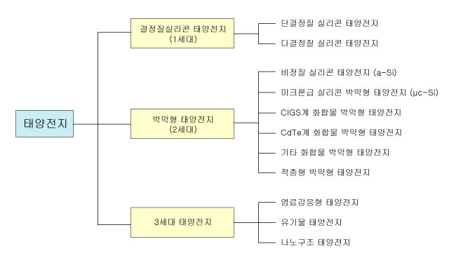 2세대 태양 전지 기술로, 1세대의 태양 전지가 소재→잉곳→웨이퍼→셀→모듈의 순차적 공정으로 처리하는 것과