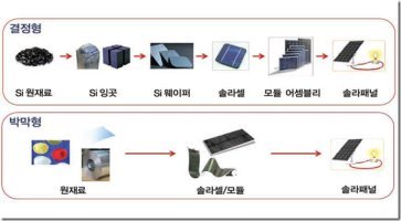 실리콘 웨이퍼 대신 값싼 유리나 금속기판 위에 반도체 박막을 증착하여 셀과 모듈을 일관 공정으로 제조하는