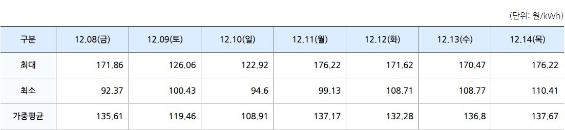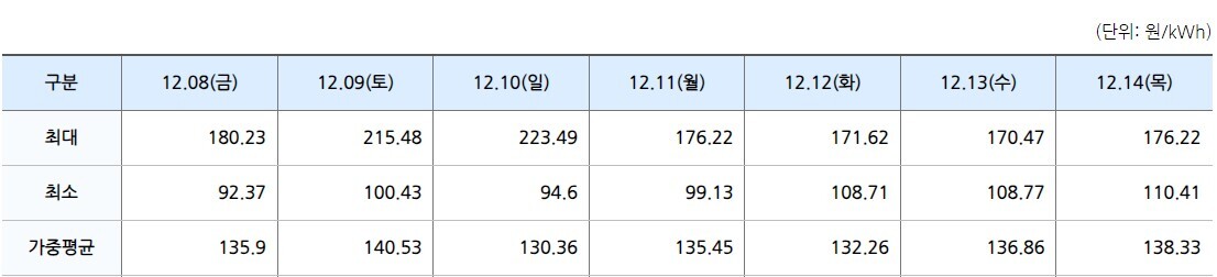 ▣ 2023년 12월 14일 태양광 사업 SMP 거래가격입니다.