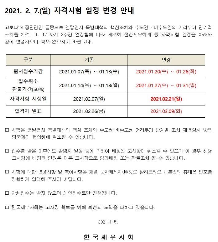 한국세무사회 2021.2.7 자격시험 일정 변경 안내 작성자한양세무(유지현)|작성시간21.01.06|조회수33 목록 댓글 0 글자크기 작게가 글자크기 크게가 다음검색 현재 게시글 추가 기능 열기 북마크 공유하기 신고 센터로 신고 댓글 댓글 0 댓글쓰기 답글쓰기 댓글 리스트
