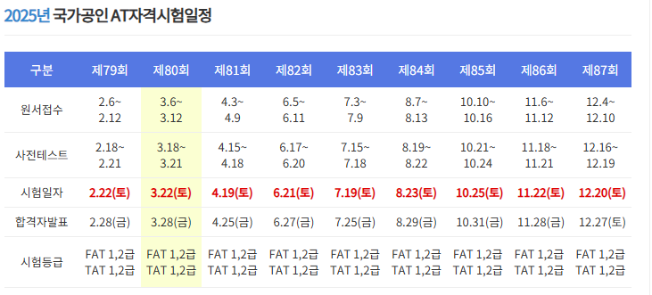 2025년 AT자격시험일정(TAT2급) 작성자카페지기(유지현)|작성시간25.03.27|조회수40 목록 댓글 0 글자크기 작게가 글자크기 크게가 다음검색 현재 게시글 추가 기능 열기 북마크 공유하기 신고 센터로 신고 댓글 댓글 0 댓글쓰기 답글쓰기 댓글 리스트
