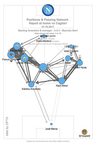 사리는 4-3-3 시스템으로 전환했고, 인시녜는 3톱의 왼쪽에서 맹활약했다. 인시녜에겐 중앙으로 파고 들면서 트레콰르티스타처럼 활동할 수 있는 자유도가 부여되었고, 그로 인해 생겨나는 왼쪽 측면 공간은 파우지 굴람이 오버래핑으로 채웠다. 물론 항상 뛰어난 마무리를 보여준 이과인의 도움을 많이 받았지만, 나폴리는 단지 스트라이커 하나에 의존하는 팀이 아니었다.