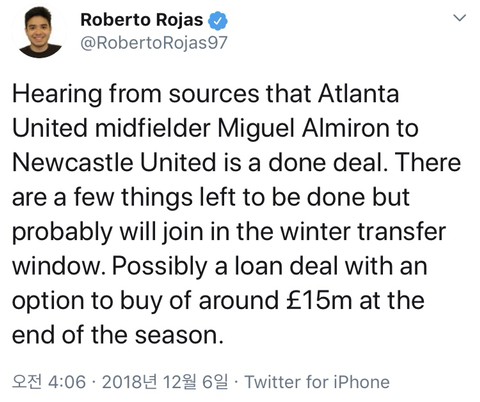 미구엘 알미론의 뉴캐슬행은 던딜이라고 밝힘