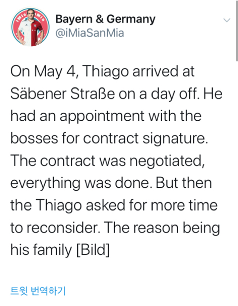 5월 4일, 휴가날 티아고는 바이에른 뮌헨 본부에 도착했다 재계약 서명을 위해 보드진과 약속이 있었다. 계약은 협상 되었고, 모든 것은 완료되었다. 하지만 그때 티아고는 재고 할 시간을 더 요청하였다. 이유는 그의 가족. 티아고 부부는 아이들과 함께 고향 바르셀로나 근처로 돌아가는 것을 고려하였다. 그러나 최근 다시 경향은 바이언쪽으로 명확해졌다. 티아고는 팀 내부에 말하였다. 그는 플릭 감독이 자신을 선수와 리더로서 인정한다는 것을 알고 있다.