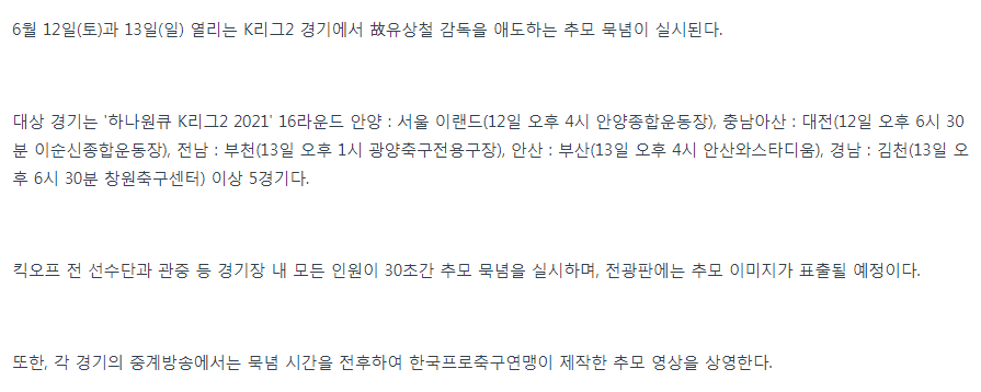 [스크랩] [공홈] 주말 K리그2 16라운드, 경기 전 故 유상철 감독 추모 묵념 실시 작성자축신 노이어|작성시간21.06.10|조회수28 목록 댓글 0 글자크기 작게가 글자크기 크게가 https://www.kleague.com/contents/news/18701? 다음검색 스크랩 원문 : 樂soccer 현재 게시글 추가 기능 열기 북마크 공유하기 신고 센터로 신고 댓글 댓글 0 댓글쓰기 답글쓰기 댓글 리스트