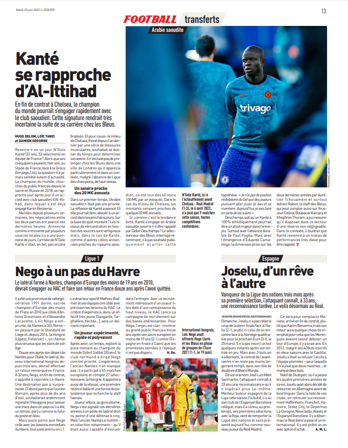 만약 캉테가 사우디로 이적한다면 데샹이 그를 다시 불러들일 수 있을까? 데샹은 100% 운동 능력을 갖춘 캉테가 미드필드에서 큰 자산이 될 수 있다는 것을 잘 알고 있다. 특히 폴 포그바의 장기 결장으로 인해 더욱 그렇다.
