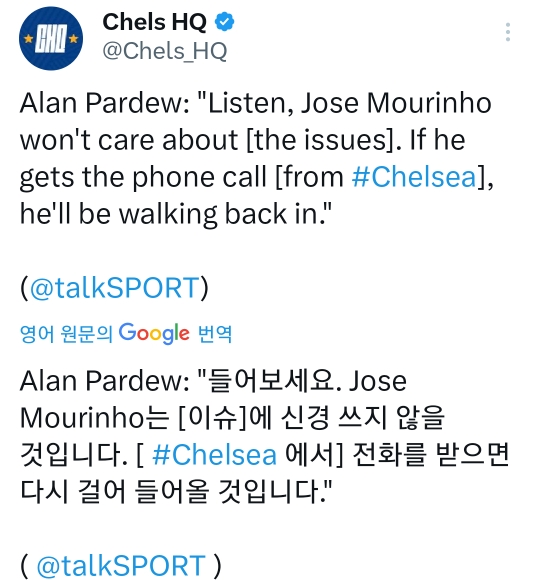 [스크랩] 파듀: 들어보세요 무리뉴는 이슈에 신경쓰지않을 것이다 첼시 전화가 오면 다시 걸어들어올 것 작성자해리 케인|작성시간24.02.05|조회수63 목록 댓글 0 글자크기 작게가 글자크기 크게가 https://twitter.com/Chels_HQ/status/1754438966777172157?t=EEtB07A2ulCyH8knVt0TiA&s=19X의 Chels HQ님(@Chels_HQ)Alan Pardew: "Listen, Jose Mourinho won't care about [the issues]. If he gets the phone call [from #Chelsea], he'll be walking back in." (@talkSPORT)twitter.com 다음검색 스크랩 원문 : 樂soccer 현재 게시글 추가 기능 열기 북마크 공유하기 신고 센터로 신고 댓글 댓글 0 댓글쓰기 답글쓰기 댓글 리스트