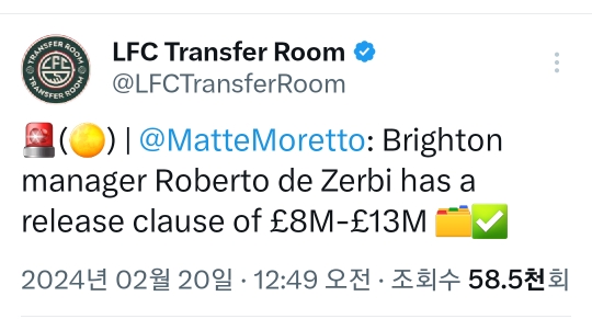 [스크랩] 마테오 모레토)데 제르비는 8m파운드~13m파운드의 바이아웃조항을 갖고있다 작성자해리 케인|작성시간24.02.20|조회수67 목록 댓글 1 글자크기 작게가 글자크기 크게가 https://twitter.com/LFCTransferRoom/status/1759606222766903691?t=cIXwn-wnoNfEH1IAYEsX9A&s=19X의 LFC Transfer Room님(@LFCTransferRoom)🚨(🌕) | @MatteMoretto: Brighton manager Roberto de Zerbi has a release clause of £8M-£13M 🗂️✅twitter.com 다음검색 스크랩 원문 : 樂soccer 현재 게시글 추가 기능 열기 북마크 공유하기 신고 센터로 신고 댓글 댓글 1 댓글쓰기 답글쓰기 댓글 리스트 작성자자연청년 | 작성시간 24.02.20 맹구...?!! 댓글 전체보기