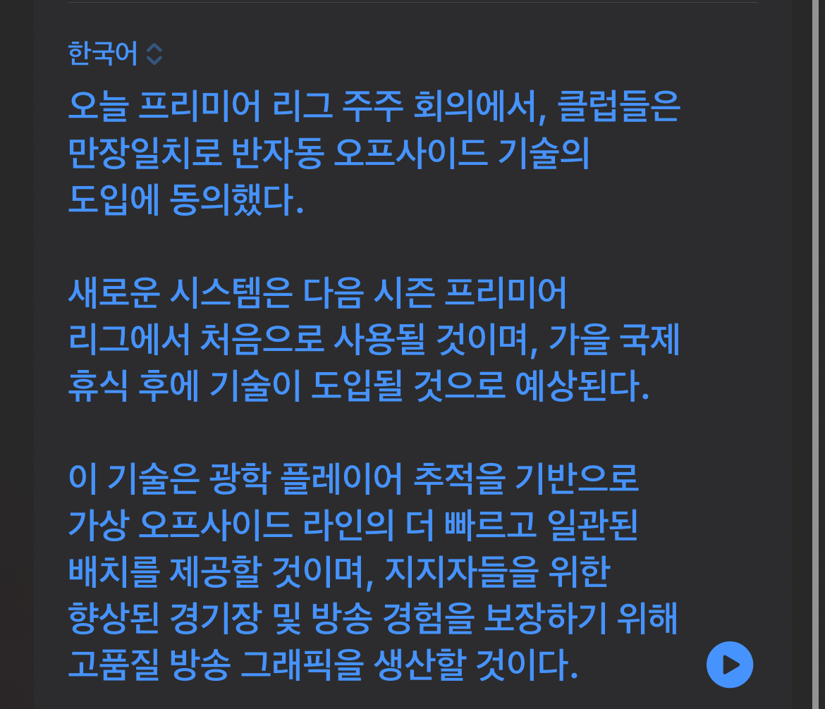 [스크랩] [오피셜] 프리미어리그 반자동 오프사이드 도입 작성자해리 케인|작성시간24.04.11|조회수146 목록 댓글 3 글자크기 작게가 글자크기 크게가 https://www.premierleague.com/news/3962262Premier League statement on Semi-Automated Offside Technology여기를 눌러 링크를 확인하세요www.premierleague.com 다음검색 스크랩 원문 : 樂soccer 현재 게시글 추가 기능 열기 북마크 공유하기 신고 센터로 신고 댓글 댓글 3 댓글쓰기 답글쓰기 댓글 리스트 작성자no.20洪skjaer ™ | 작성시간 24.04.11 드디어 작성자펠라이니 | 작성시간 24.04.11 진작했어야.. 작성자몰라용ㅇㅇㅇ | 작성시간 24.04.12 조정간 반자동! 댓글 전체보기
