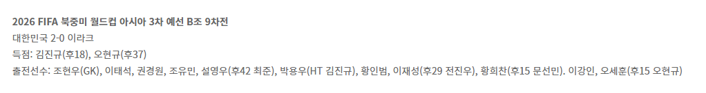 [스크랩] [공홈] 2026 FIFA 북중미 월드컵 아시아 3차 예선 B조 9차전: 대한민국 2-0 이라크 작성자해리 케인|작성시간25.06.06|조회수100 목록 댓글 0 글자크기 작게가 글자크기 크게가 https://www.kfa.or.kr/ 다음검색 스크랩 원문 : 樂soccer 현재 게시글 추가 기능 열기 북마크 공유하기 신고 센터로 신고 댓글 댓글 0 댓글쓰기 답글쓰기 댓글 리스트