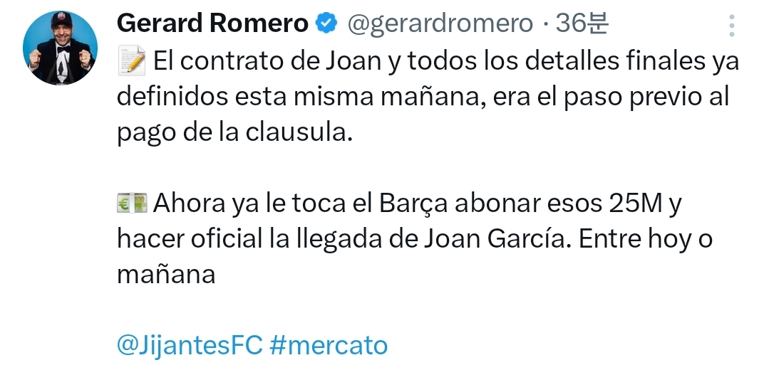 주안 가르시아의 계약과 모든 최종 세부사항은 오늘 오전에 마무리됐고 이는 바이아웃 조항을 지불하기 전의 첫 번째 단계였다. 이제 바르셀로나가 €25m를 지불하고 가르시아의 이적을 공식화할 차례이다. 이는 오늘~내일 일어날 것이다.