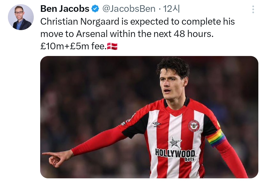 [스크랩] [벤 제이콥스 外] 뇌르고르, 48시간 내로 아스날 이적 완료할 듯...£10m+5m 작성자해리 케인|작성시간25.07.08|조회수35 목록 댓글 0 글자크기 작게가 글자크기 크게가 https://x.com/JacobsBen/status/1942293389560398177?t=5dpTZJolvNRjAhu8qh_Hlg&s=19Arsenal finalising Norgaard move this week as Gyokeres talks ramp upThe Brentford captain is set to take summer spending beyond £70millionwww.standard.co.uk 다음검색 스크랩 원문 : 樂soccer 현재 게시글 추가 기능 열기 북마크 공유하기 신고 센터로 신고 댓글 댓글 0 댓글쓰기 답글쓰기 댓글 리스트