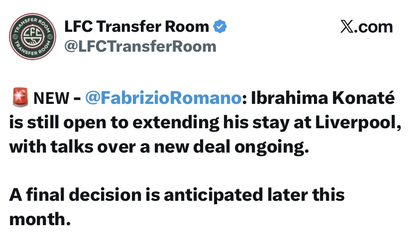 [스크랩] [파브리지오 로마노] 코나테는 계약 연장으로 리버풀에 잔류하는 것에 여전히 열려있으며 협상 진행중임 작성자민방위공병 (해리 케인)|작성시간08:54|조회수15 목록 댓글 0 글자크기 작게가 글자크기 크게가 최종 결정은 이 달 말에 나올 것으로 예상됨.https://x.com/lfctransferroom/status/2040138252112294275?s=46X의 LFC Transfer Room님(@LFCTransferRoom)🚨𝗡𝗘𝗪 - @FabrizioRomano: Ibrahima Konaté is still open to extending his stay at Liverpool, with talks over a new deal ongoing. A final decision is anticipated later this month.x.com 다음검색 스크랩 원문 : 樂soccer 현재 게시글 추가 기능 열기 북마크 공유하기 신고 센터로 신고 댓글 댓글 0 댓글쓰기 답글쓰기 댓글 리스트