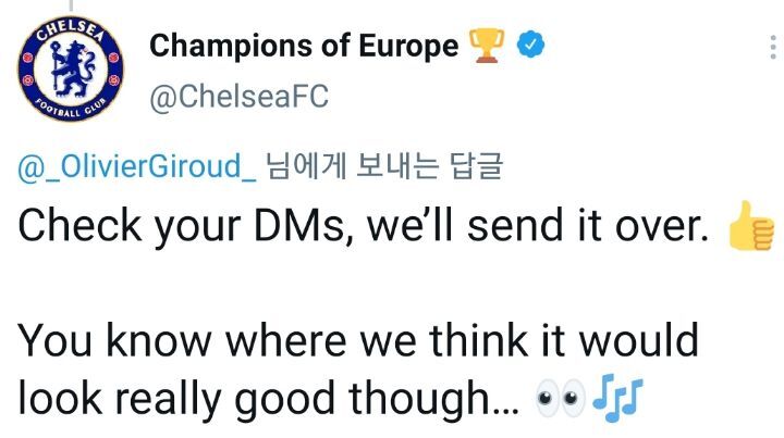 지루 : 첼시야, 지난 주 내가 코밤 트레이닝 센터에서 넣은 골 영상이 있어? 있으면 공유해줘