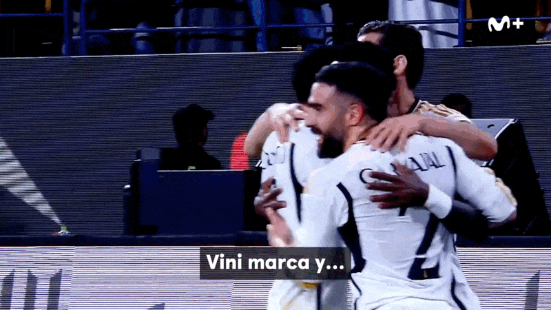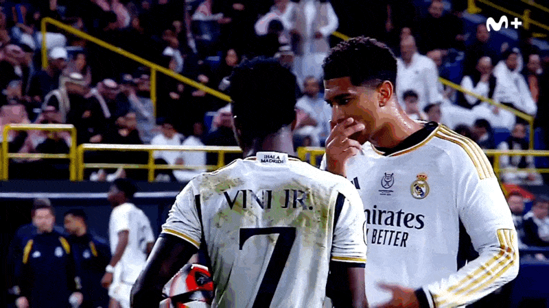 PK를 성공시키며 해트트릭을 달성한 후 벨링엄을 안아주는 비니시우스