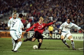 • 1999/2000 시즌 32강 조별 리그에서는 롤랑 쿠르비 감독이 지휘하던 올랭피크 마르세유와 유나이티드가 격돌한 적이 있습니다. 1999년 9월 29일 올드 트래포드에서 열린 경기에는 이브라히마 바카요코에게 선제골을 허용했는데도 후반 33분 앤드루 콜과 37분 폴 스콜스가 잇달아 골을 터뜨린 유나이티드가 2-1로 승리를 거두었습니다. 스타드 벨로드롬에서는 후반 24분 빌리앙 갈라스가 선제골을 터뜨린 마르세유가 승리했지만, 이날 결과에 상관없이 유나이티드가 조 1위로 16강 조별 리그에 올랐고, 마르세유는 2위로 진출했습니다.