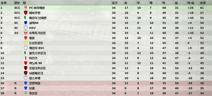 분데스리가는 뮌휀이 2연패를 하였고 브레멘은 다시 챔스티켓을 확보하였습니다.