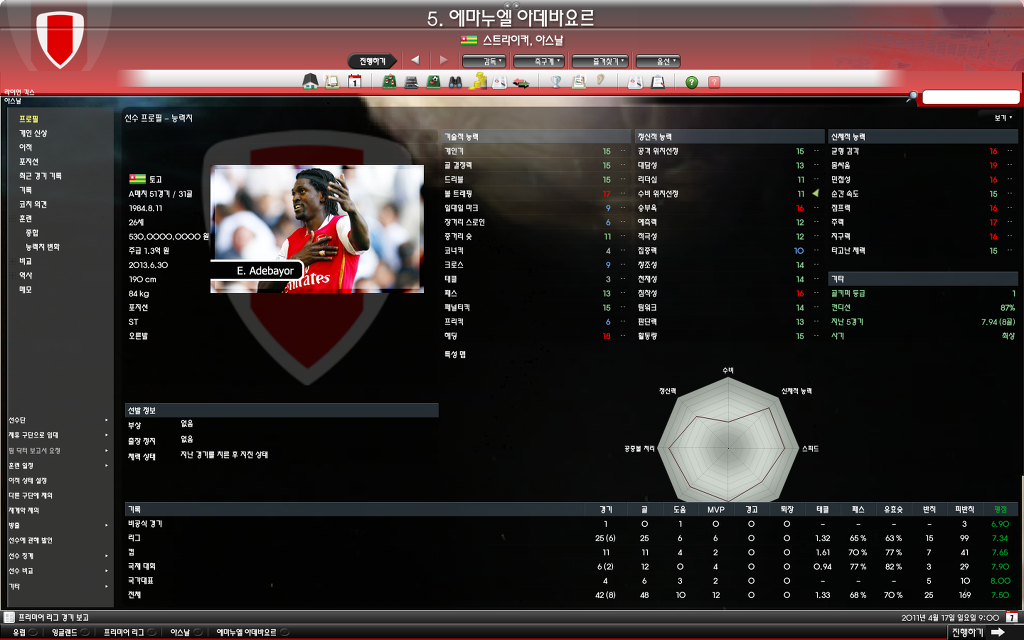 아스널 3시즌이 지나면서 몸값도 많이 상승한 아데발 꾸준히 한시즌한시즌 지날때마다 득점이 좋아지는걸 보면 흐믓합니다. ㅎㅎ