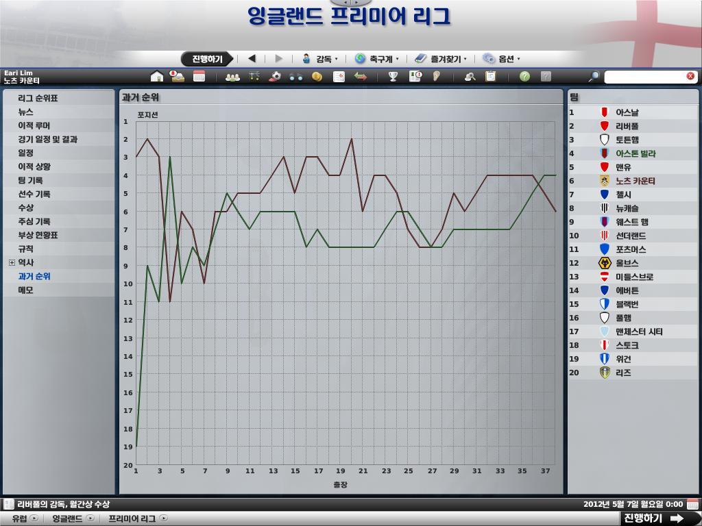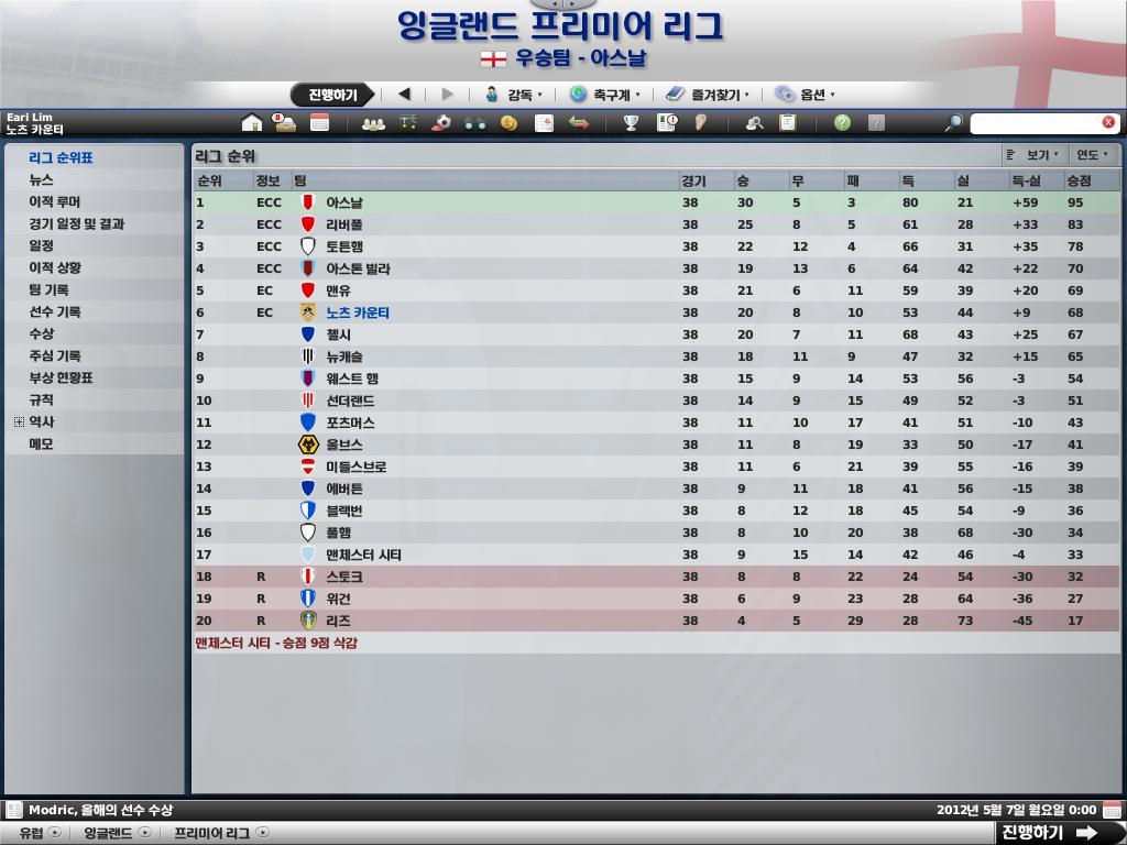 마지막 38라운드에서 망할 블랙번 에게 덜미를 잡히는 바람에 4위에서 6위로 추락 했습니다.ㅠ.ㅠ