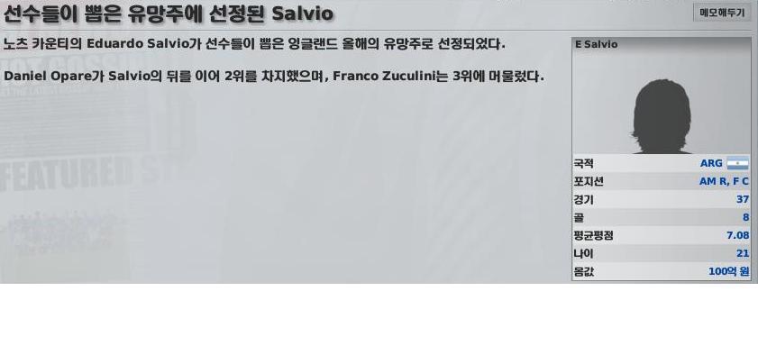 다음은 저희팀 서포터가 뽑은 MVP상과, 잉글랜드 선수들이 뽑은 올해의 유망주 상을 받은 살비오 선수입니다.
