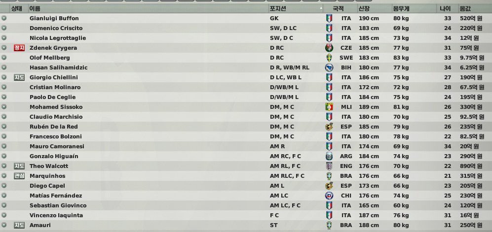 제가 주로 4-4-2와 4-3-3을 번갈아가면서 쓰기 때문에 중미와 공미 선수들의 숫자가 상당히 많습니다.